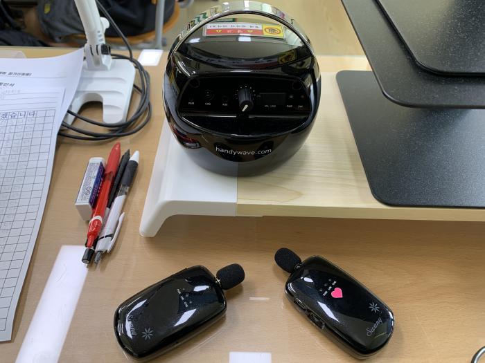 그런데 문제는 스피커를 켜둔 상태에서 송신기의 전원 버튼을 누르면 딸깍 소리가 스피커를 통해서 딸깍! 하고 퍼지네요. 물론 큰소리는 아닌데, 조용히 독서하는 교실에서 제가 송신기 전원버튼을 켜고 끈다면 제일 끝에 있는 학생도 들리긴 하는 정도네요.